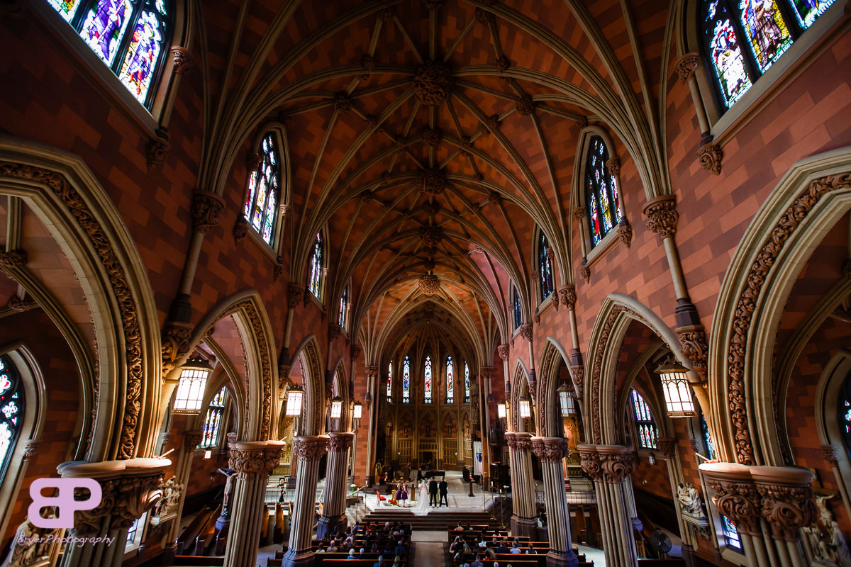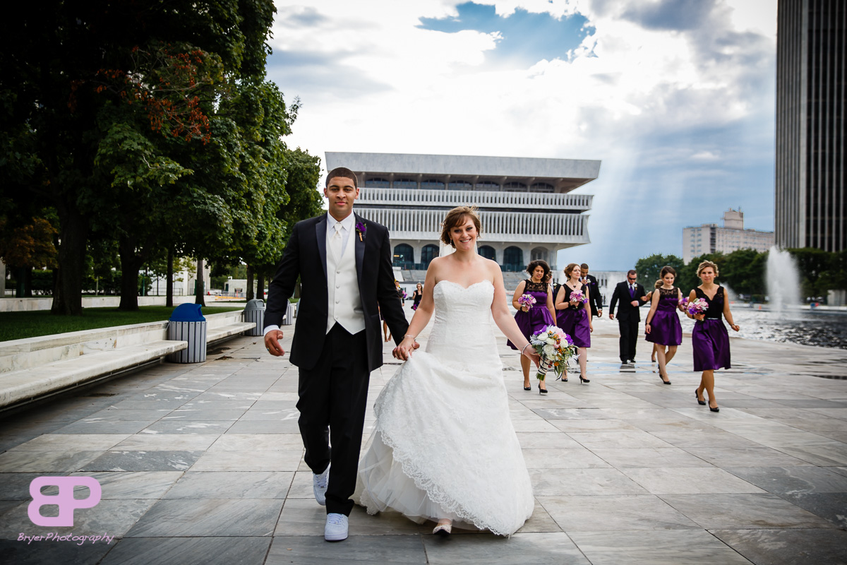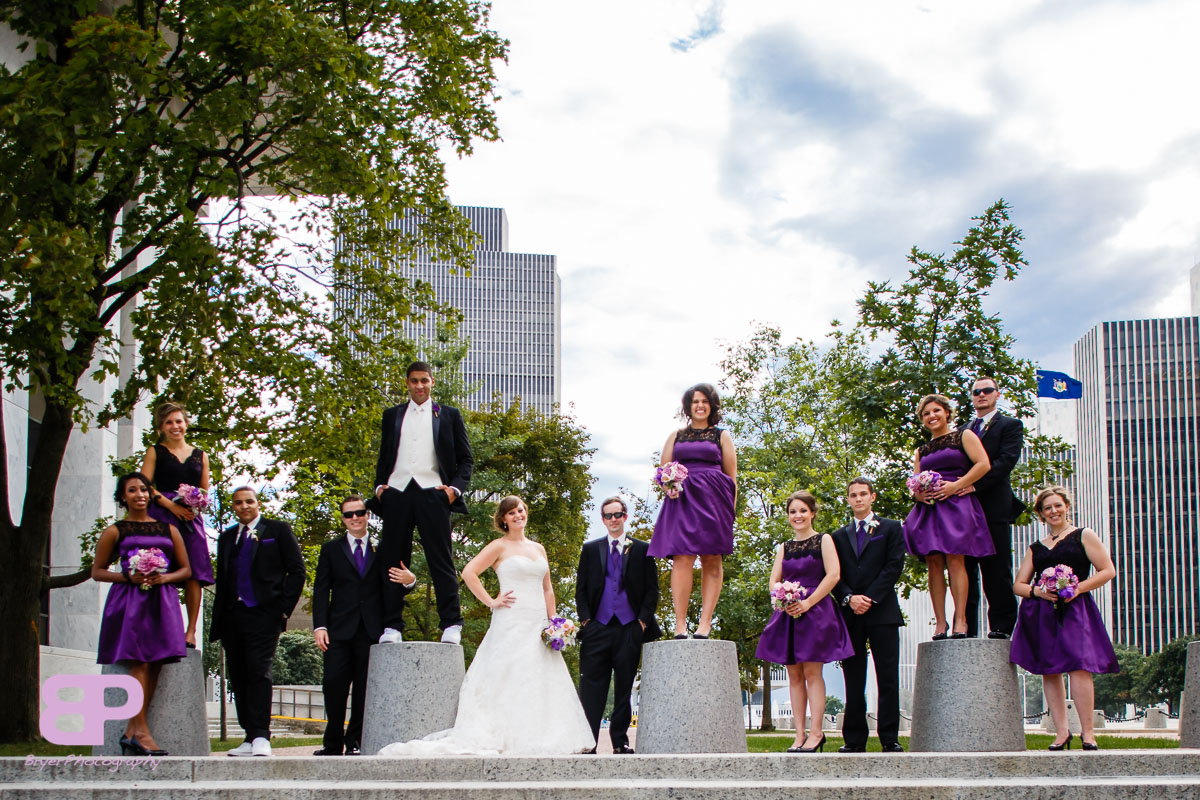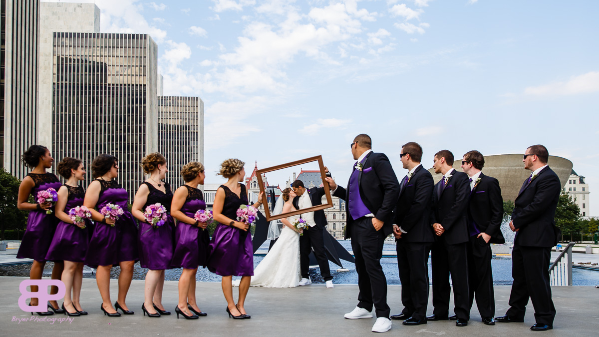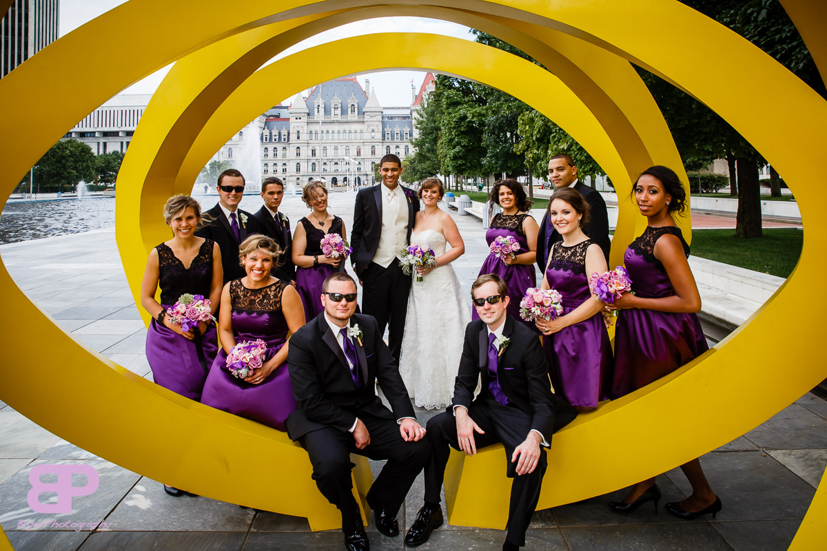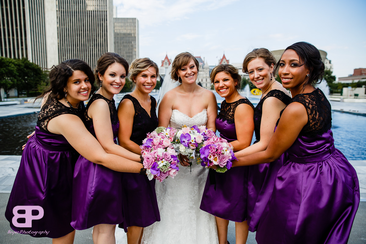 Jackie and Jared are not new to the blog. We first shot their engagement a year ago at Indian Ladder Farms, then they braved the old St John’s church for our first Urban Decay Project shoot. Well the third installment of their photo trilogy is their wedding day… which was perfection. When you have a couple as warm and fun as Jackie and Jared, there is a good chance that their friends and family will exude the same kind of energy, and they certainly did. It was nothing but smiles, love, and laughter from when we met them at the hotel that morning to when we said goodbye to them on the dance floor. They got married at the beautiful Cathedral of Immaculate Conception. After that, they and their party began their walk to 90 State which included bravely trekking across the wind tunnel that is the Empire State Plaza. Jackie and Jared had a lovely choreographed first dance that was followed by beautiful toasts and parent dances. Then the dance floor opened for some very high-energy moving and shaking. Mixed in between dance sets was a seductive garter retrieval, a pretty intense bouquet toss, some cake cutting, and some groomsmen karaoke-serenading the groom. I couldn’t picture a more beautiful day for a more beautiful couple, inside and out. Congrats, Jackie and Jared!