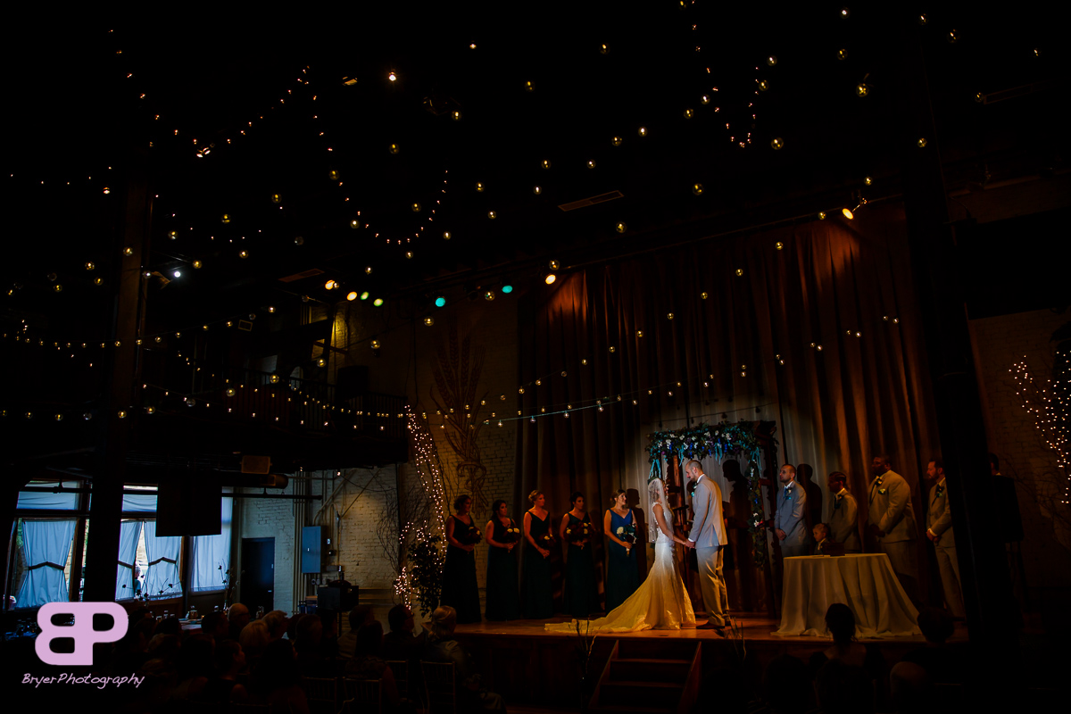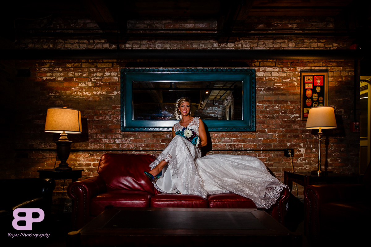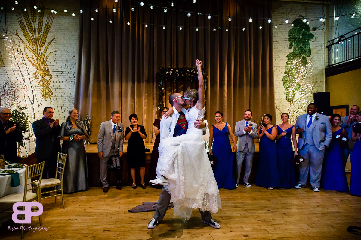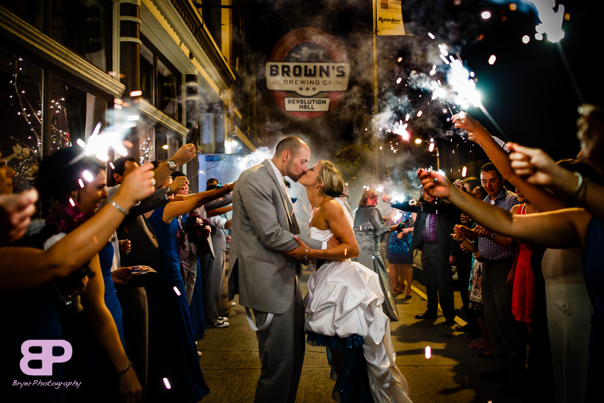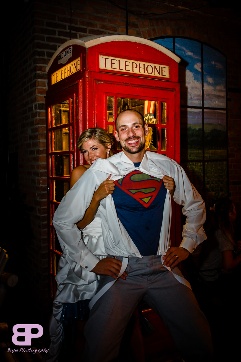 When you work with couples this much fun, it’s really not fair to call it work. ;) We started by dividing up where Nichole and Matt were getting ready so that they could each get a picture with one of their fur babies. After that, we met them at Revolution Hall which looked stunning, thanks in part to Nichole’s mom who HAND MAID the two story curtain for the stage they were married on (which we later found out was purchased with the promise of more business from the venue!) The decorations were beautiful, the bridal party was beautiful, and the ceremony was… you guessed it, beautiful. After the two said their i dos, we were off to take pictures with the bridal party. Now the entire bridal party was great, but frankly the ring bearer, Sawyer, brought ring-bearing to new levels. This kid not only carried the real rings, but he could work a pose with the smallest of direction. He could have a future career here. On to the reception though, Nichole and Matt rocked their intros with cool shades and guitar skills. The dancing continued into first dance, parent dances, dance sets, and even a surprise dance set from the girls in the bridal party which featured Nichole rocking a whole new fabulous dress (also made by her very talented mother!) Once we realized Matt had a Superman tee under his suit, we took an obligatory Clark Kent-esque photo in front of the phone booth. The two also braved trekking up hot, humid, and dark unfinished floors to take a few extra shots. A sparkler send off ended this beautiful day, but not before they got back to the dance floor to bust a few more moves. Nichole and Matt had an amazing wedding day… which is no surprise because they are truly an amazing couple.