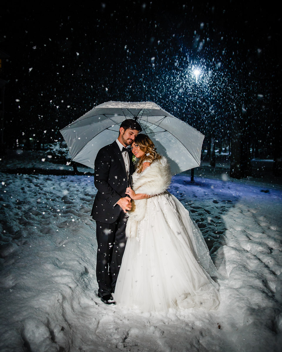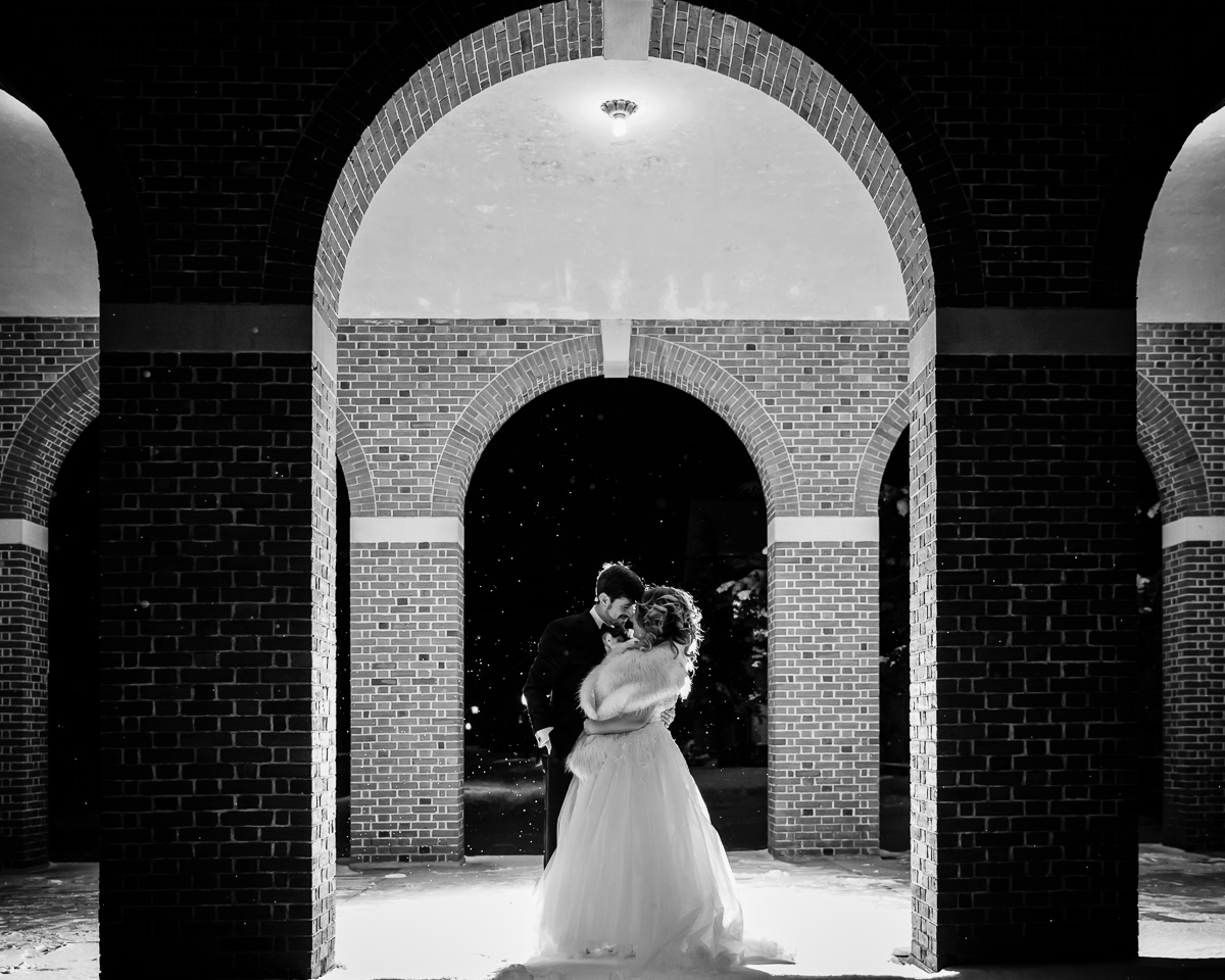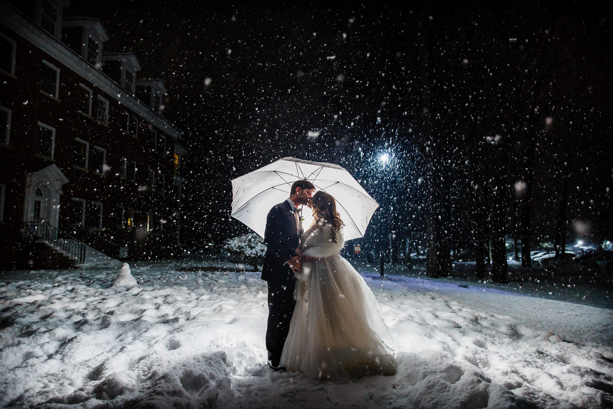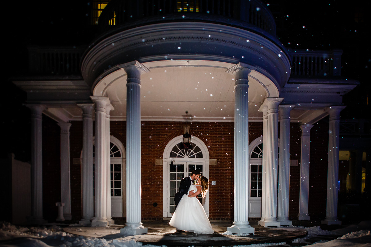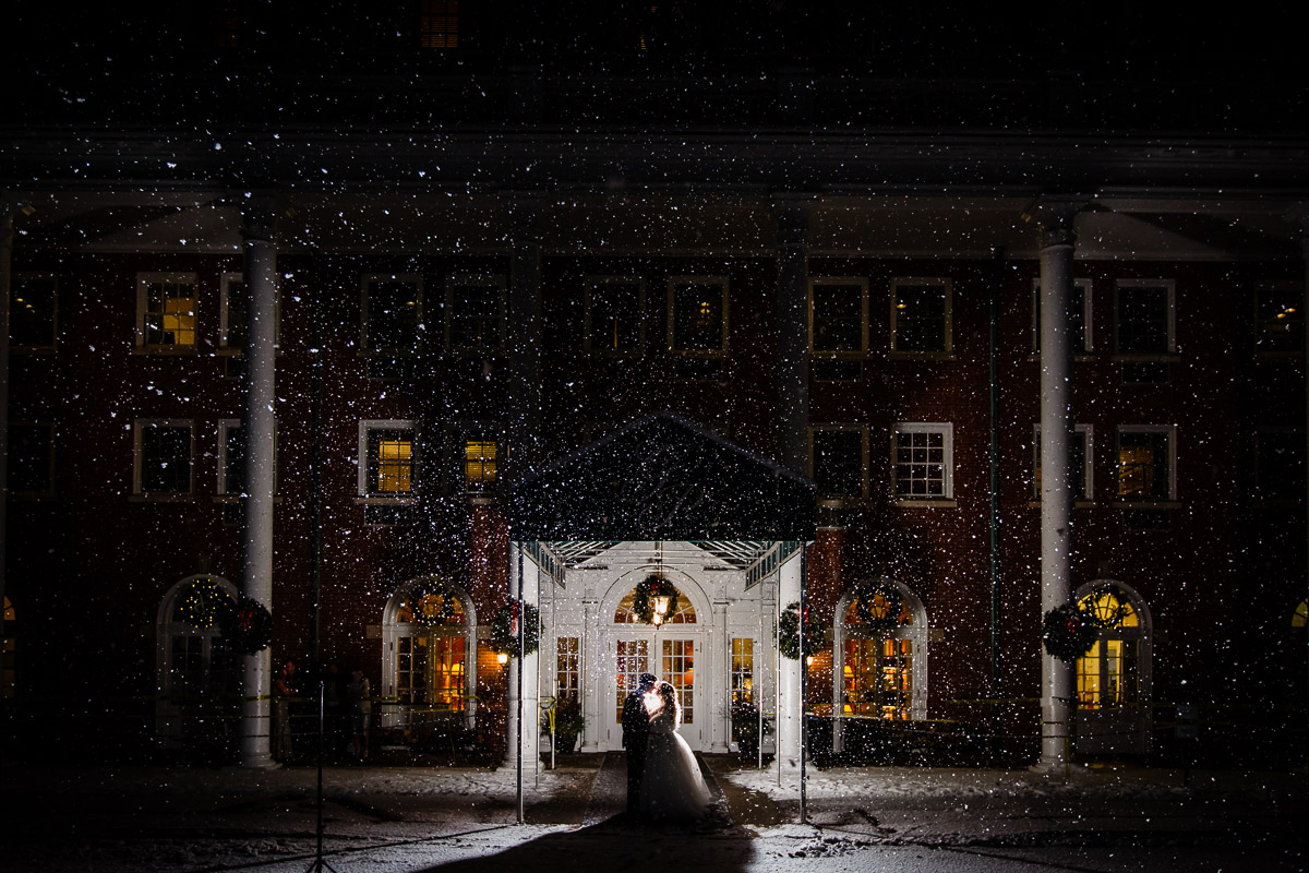 Well New Year’s Eve is meant to celebrate new beginnings, and Dana and Chet decided to take this opportunity to start their new beginning as husband and wife. (Not to mention this was a first for us too: our first time shooting a New Year’s wedding!) The two got married in the very cozy Gideon Putnam in Saratoga, just one door away from each other. After a first look there in the room, we headed down for family photos and a few quick shots at Hall of Springs where we were successful keeping the two relatively dry in the picturesque snow-filled landscape. The two had a sweet ceremony with vows they wrote for each other. After that, it was just a quick walk down the hall to where the party started and kept on rocking until well after midnight. Dances, toasts, and dinner gave way to an open dance floor that was busy all night. The photo booth was also a big hit. As if the night couldn’t get any better, a soft, heavy snow fell throughout the reception, creating a winter wonderland backdrop for the reception. We had so much fun ringing in the New Year with this fun couple and the friends and family that came to celebrate their marriage. We wish these two a happy and healthy New Year as newlyweds!
